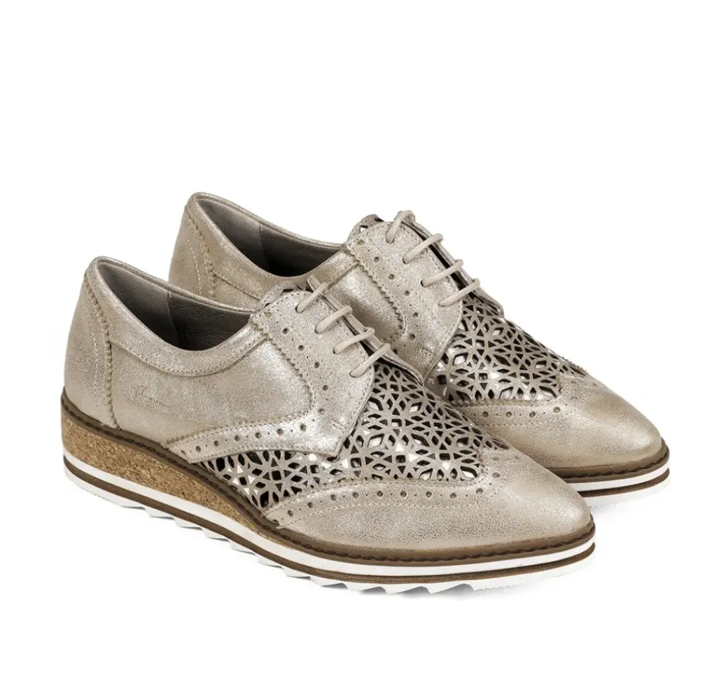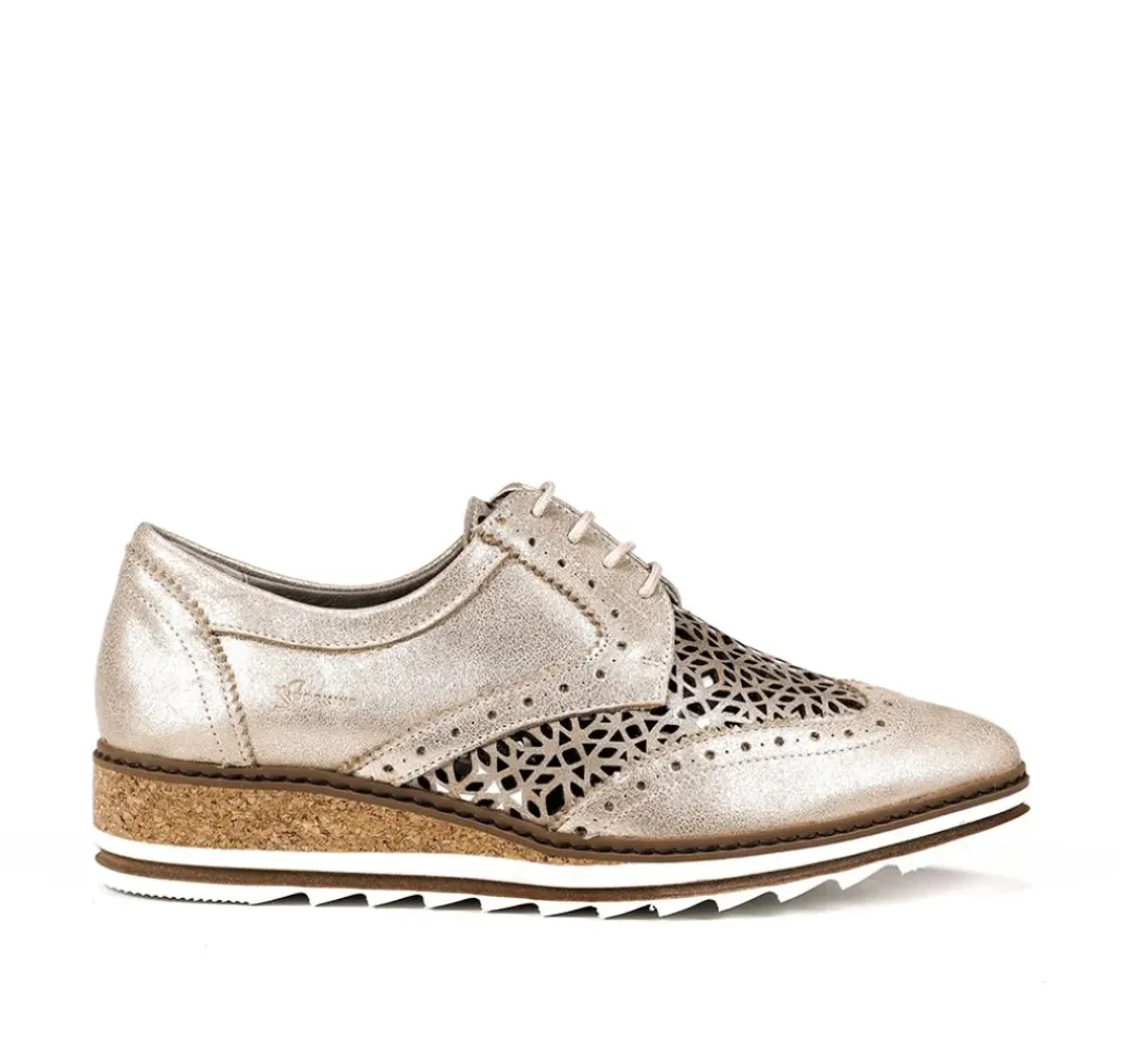Yaiza, personalidad y estilo. Zapato de cordones con cuña de corcho, acabado metalizado y detalle en el empeine que hace que este modelo sea muy especial.